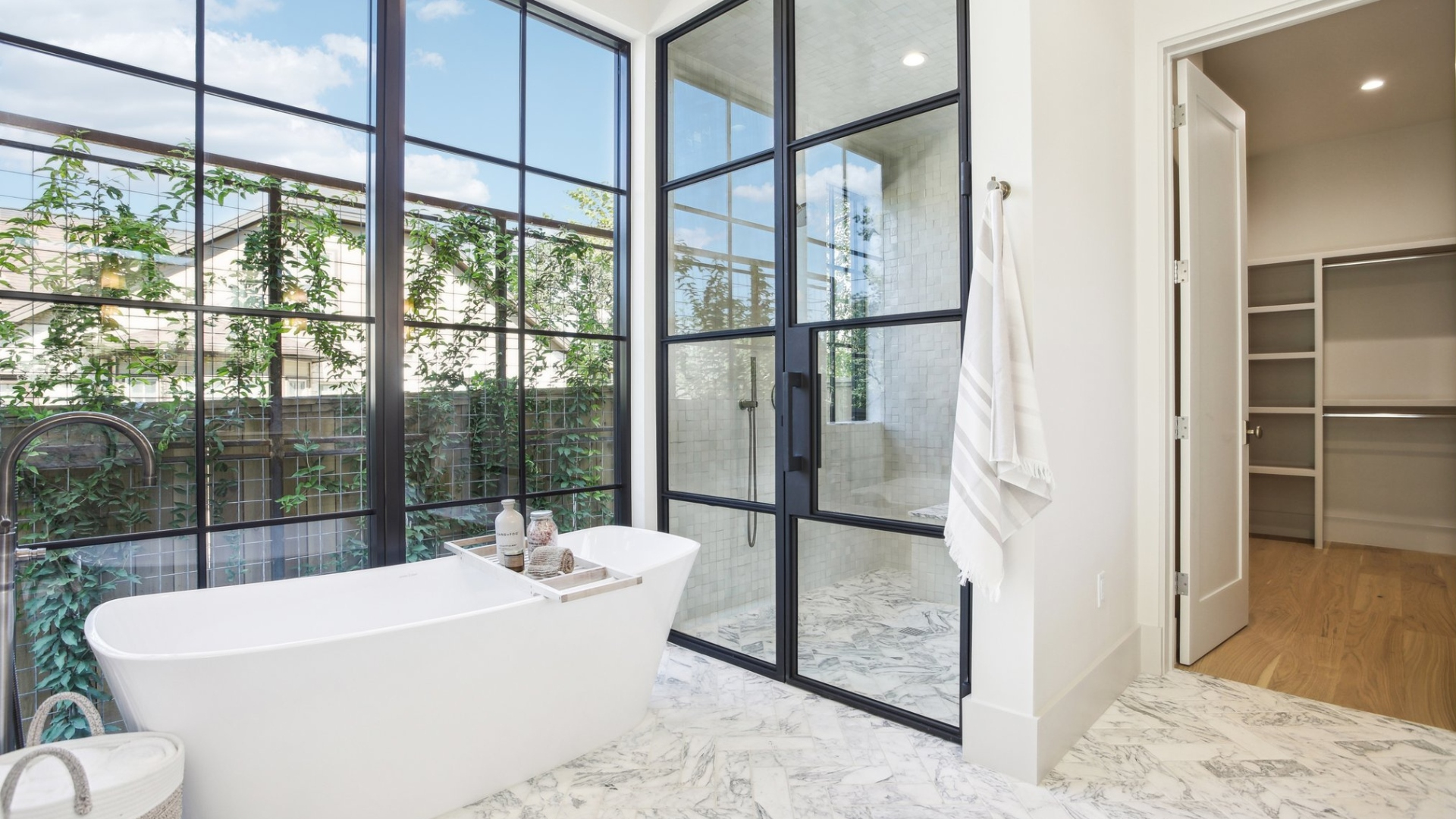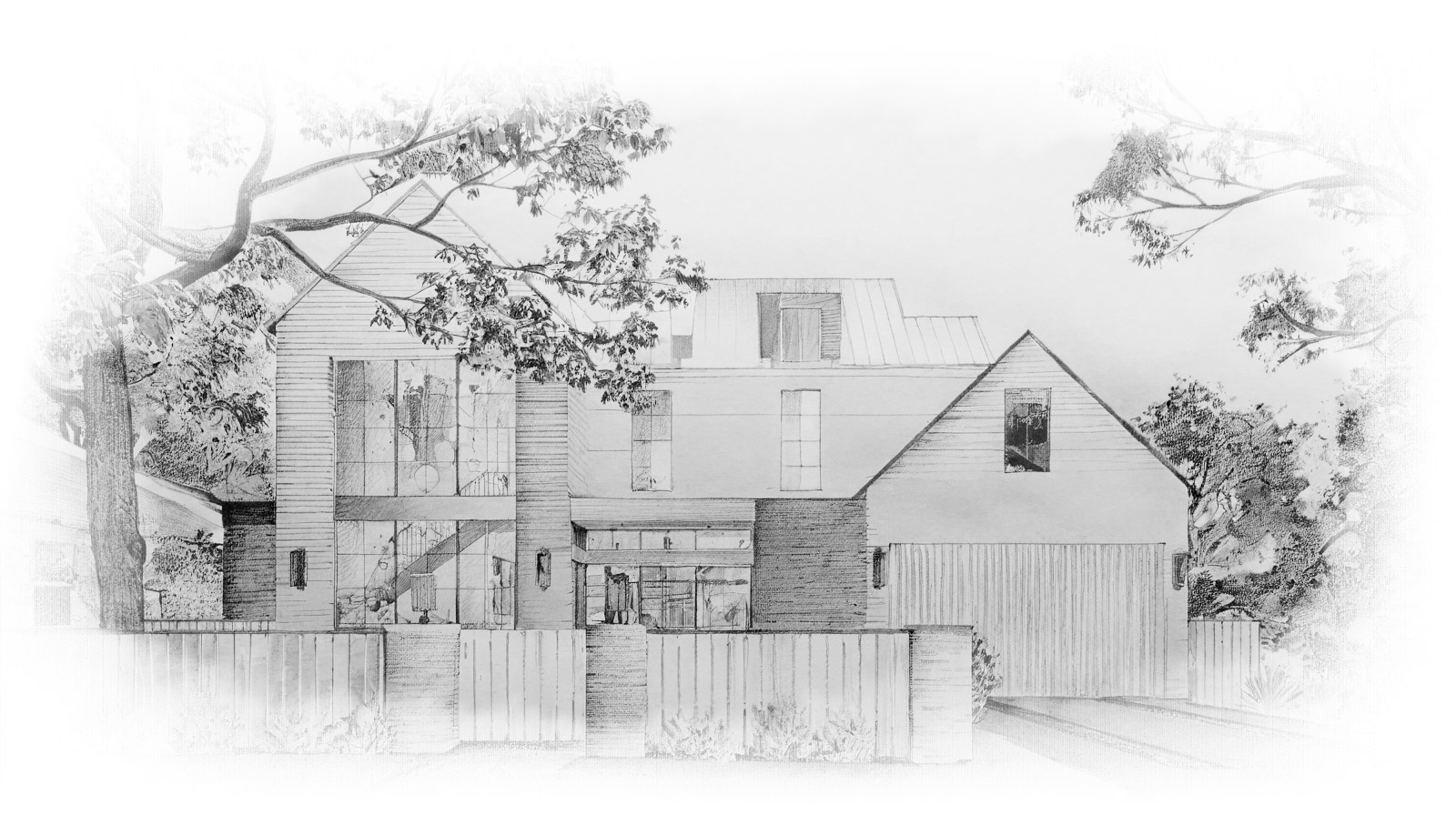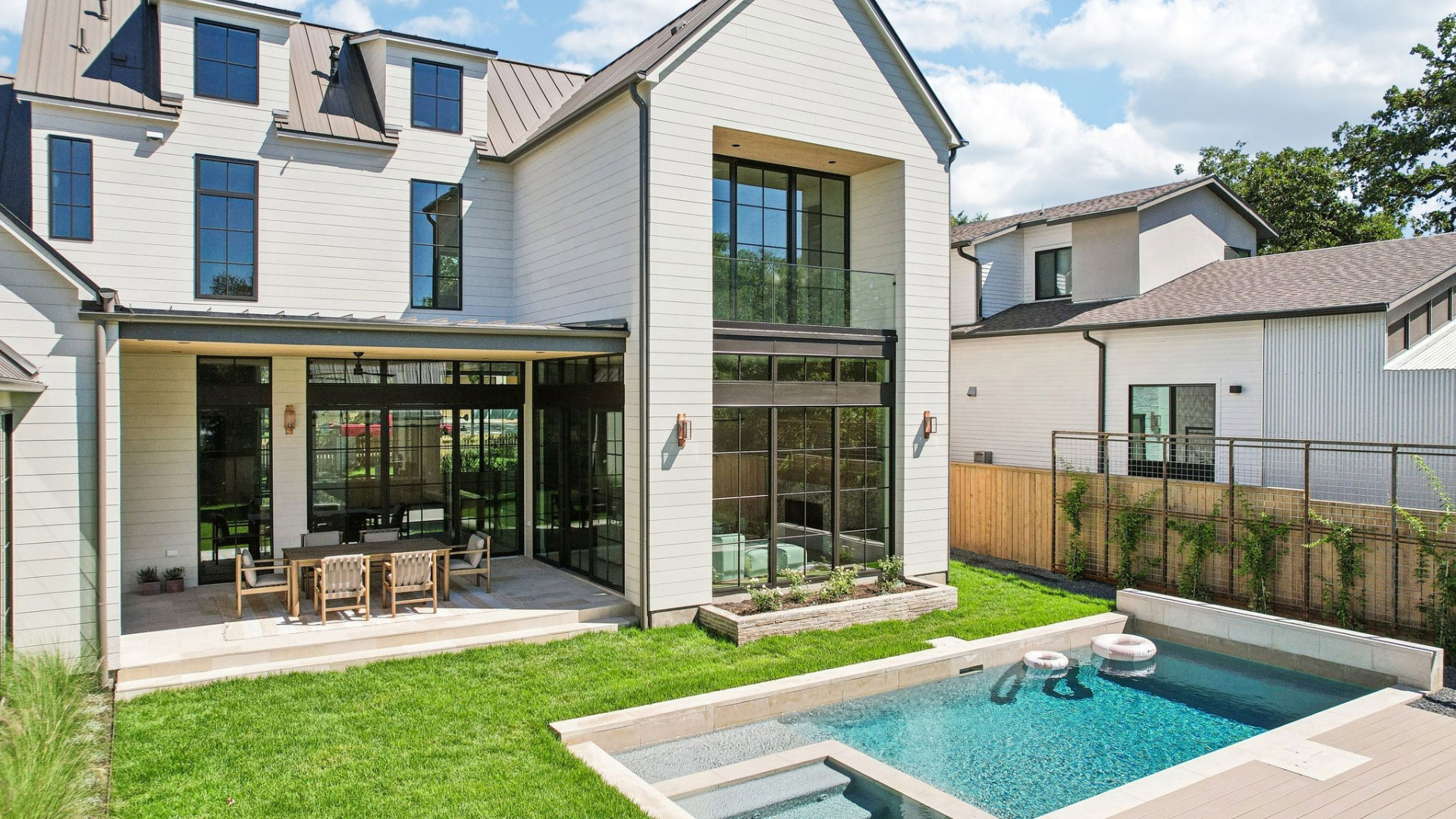 A stunning custom wood garage paired with a matching fence brings a seamless sense of consistency to the space.