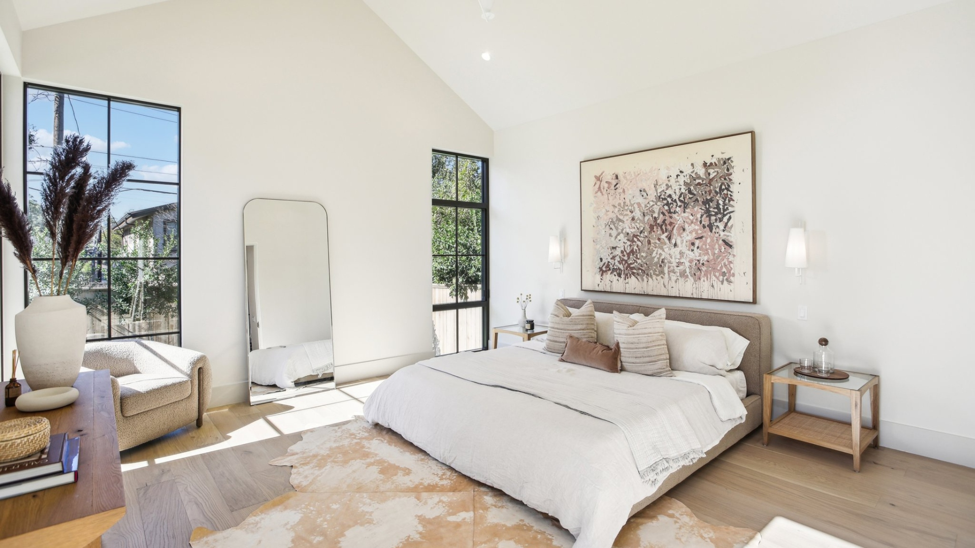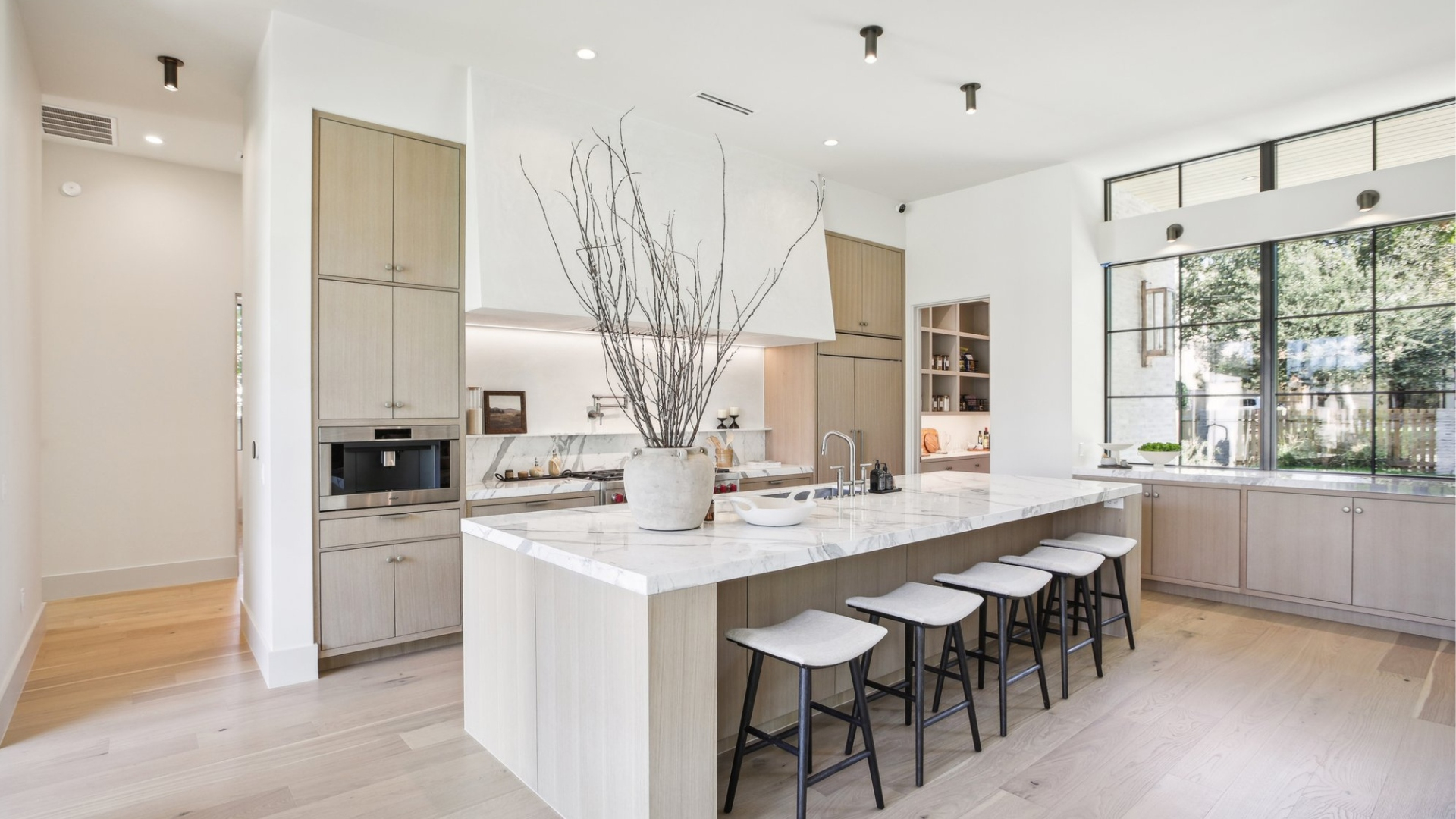 Coordinated flooring and cabinetry bring a sense of calm and simplicity to the space.