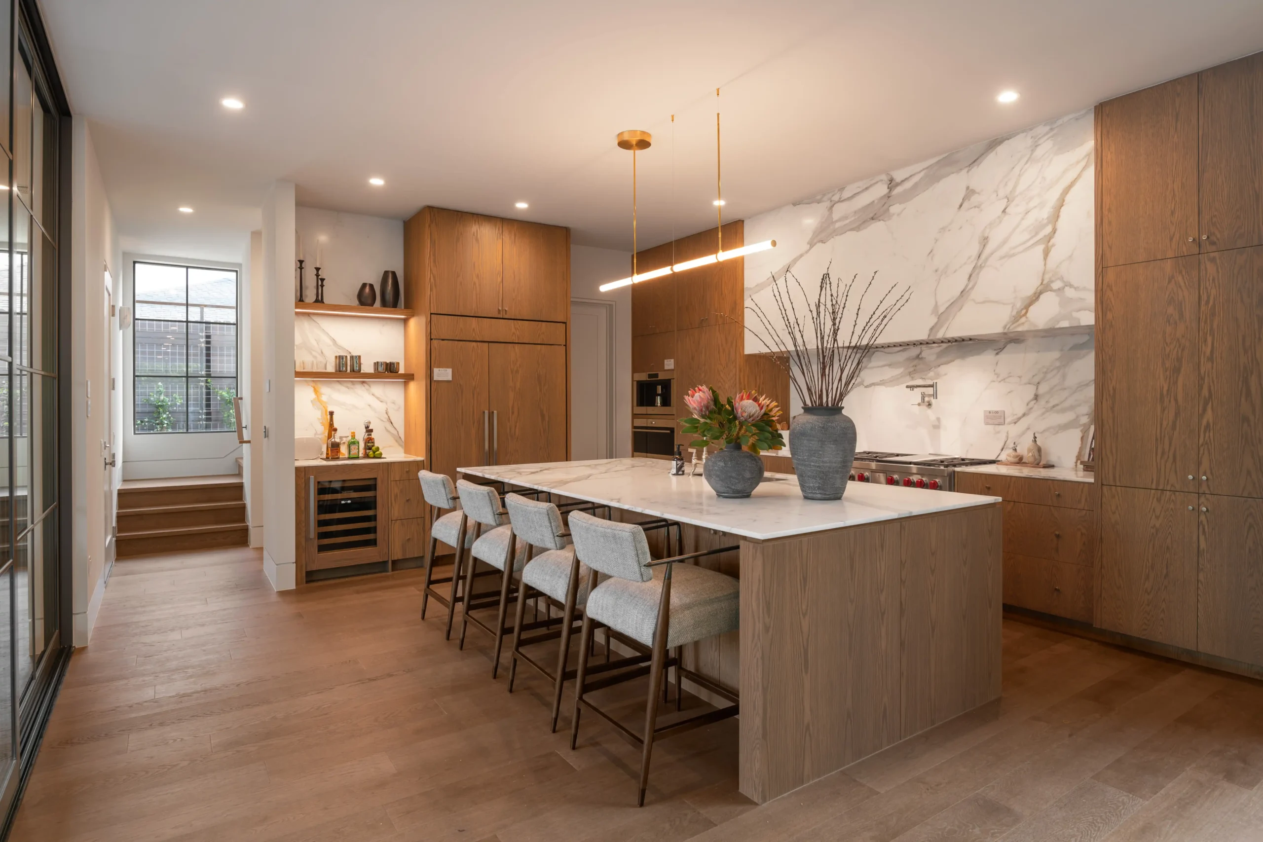 Custom wood cabinetry with an integrated refrigerator maintains a sleek and refined kitchen aesthetic