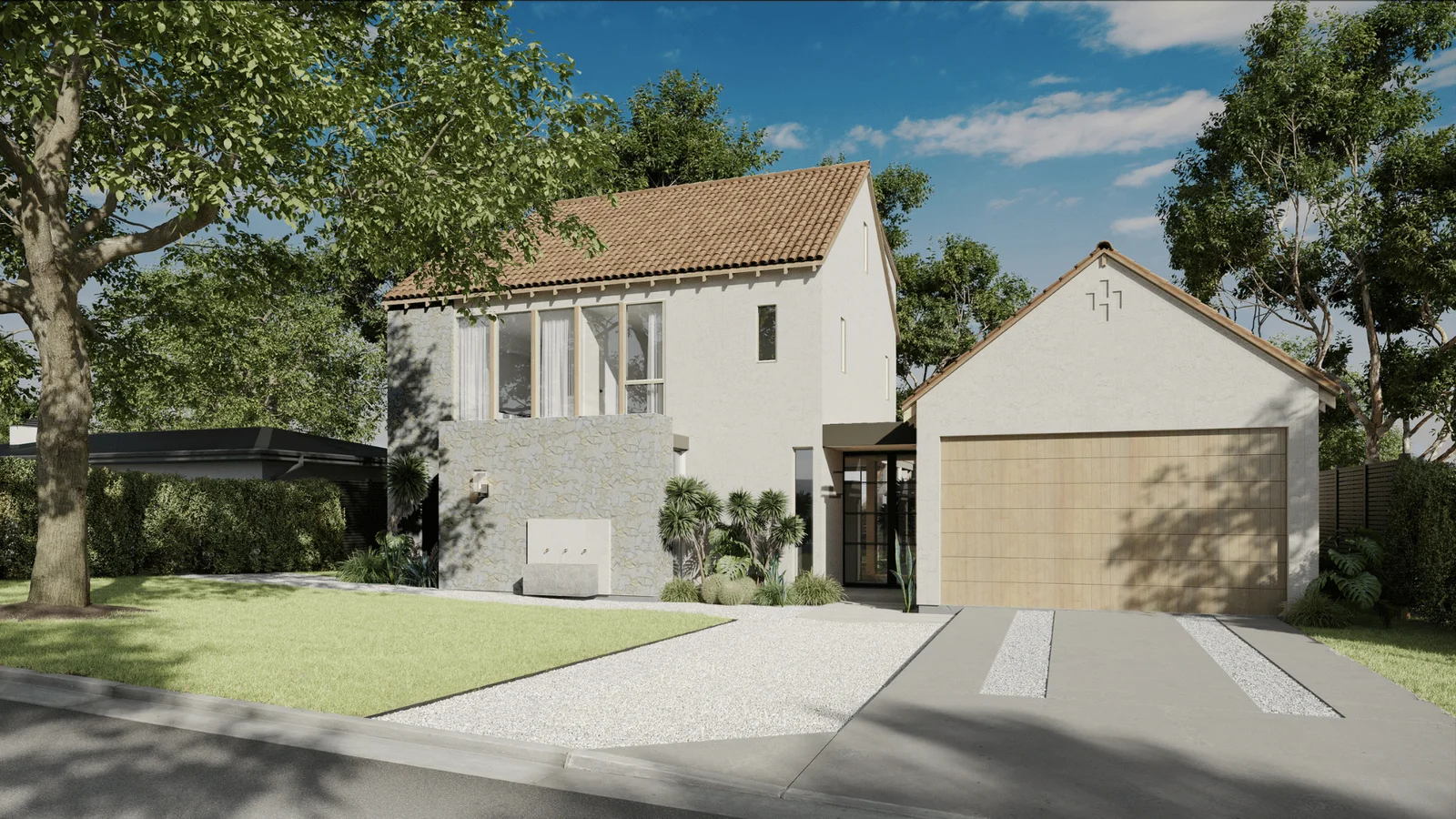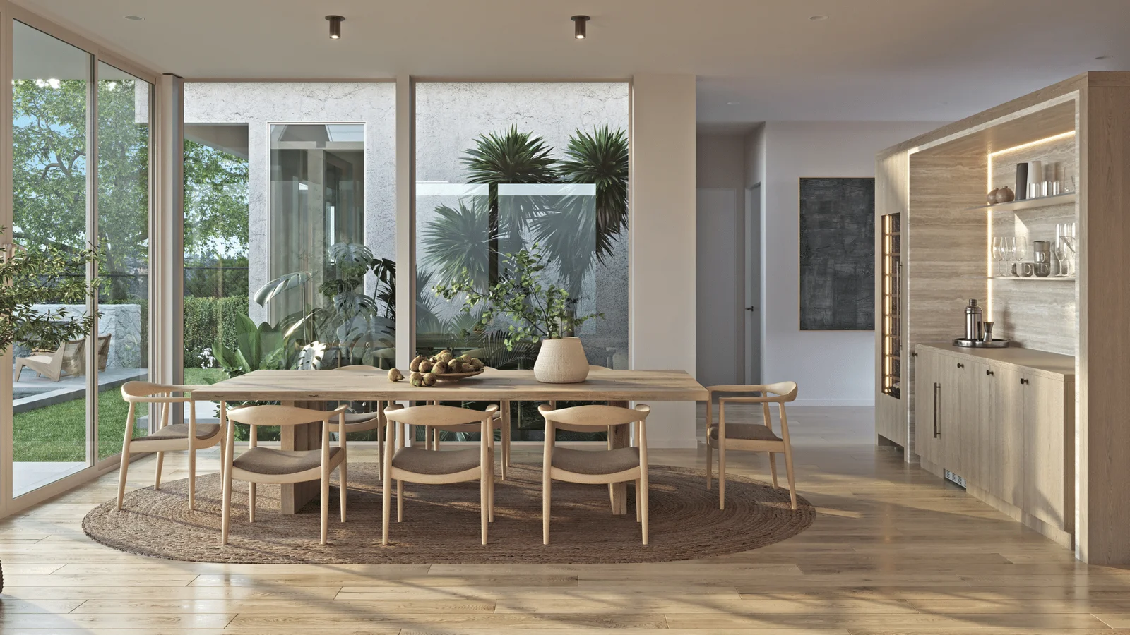 Grand floor-to-ceiling windows elegantly merge the indoors with the outdoors, inviting nature into the living space