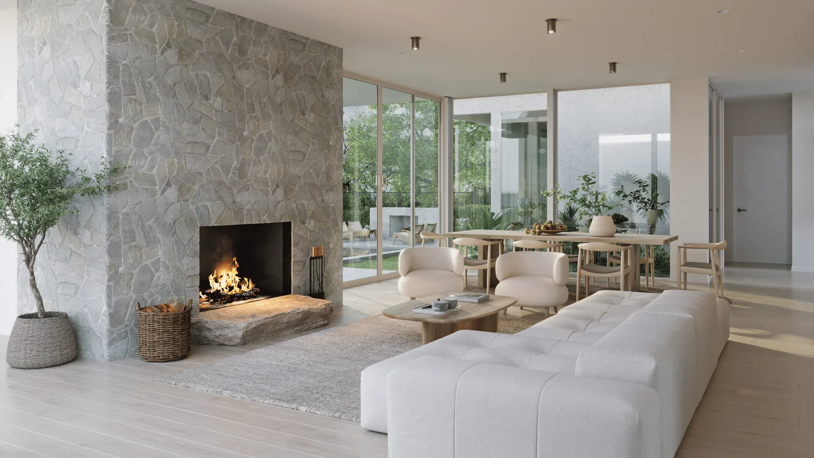 A natural stone fireplace, framed by windows, appears to rise organically from the earth