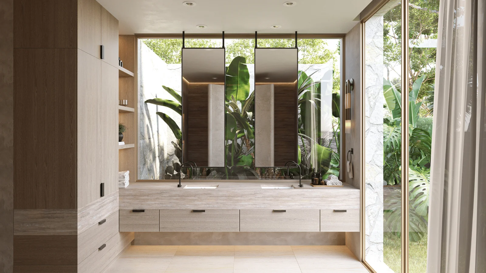 The bathroom windows are designed with a biophilic focus, inviting nature inside