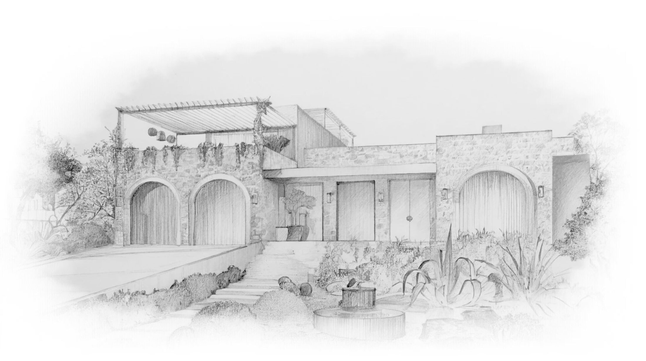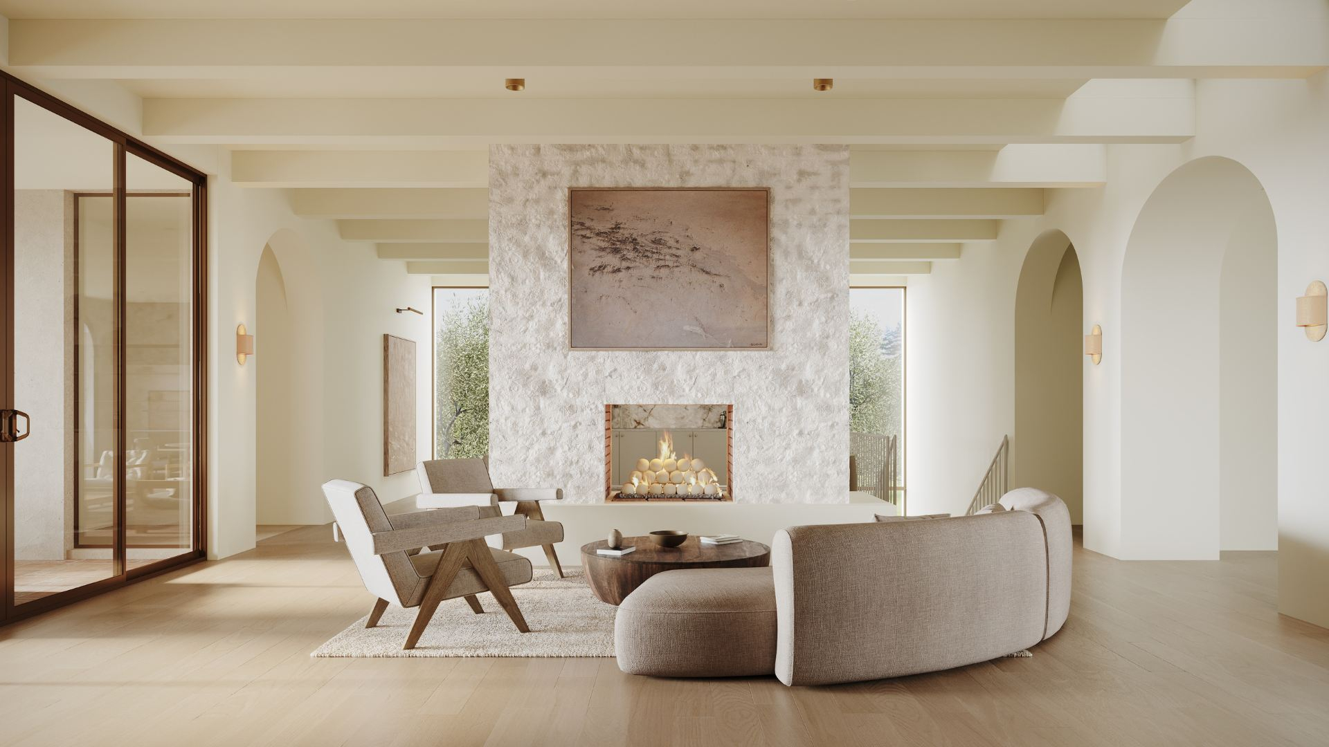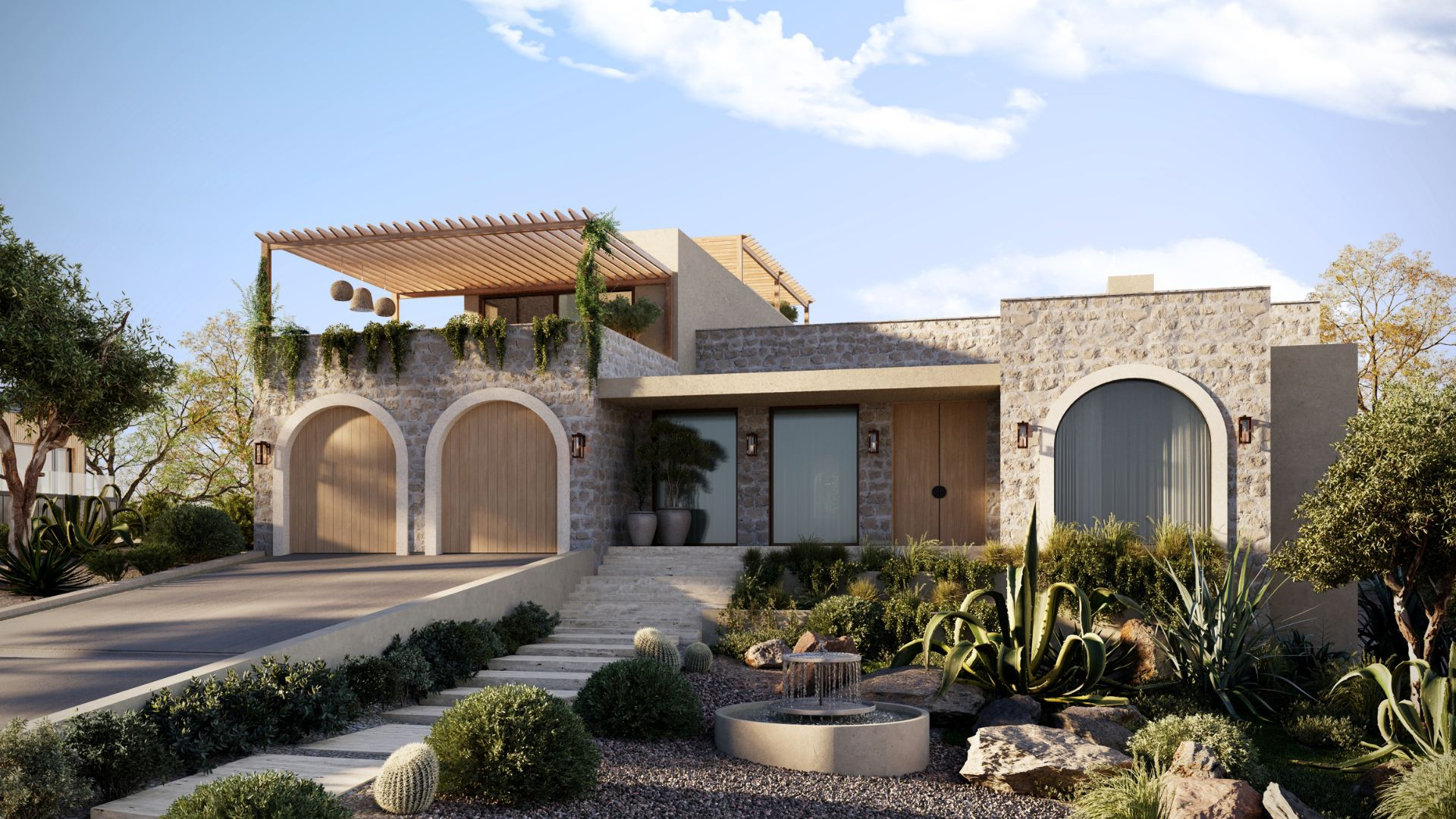 The curved doors add a softness to the exterior, blending seamlessly with the surrounding landscape.