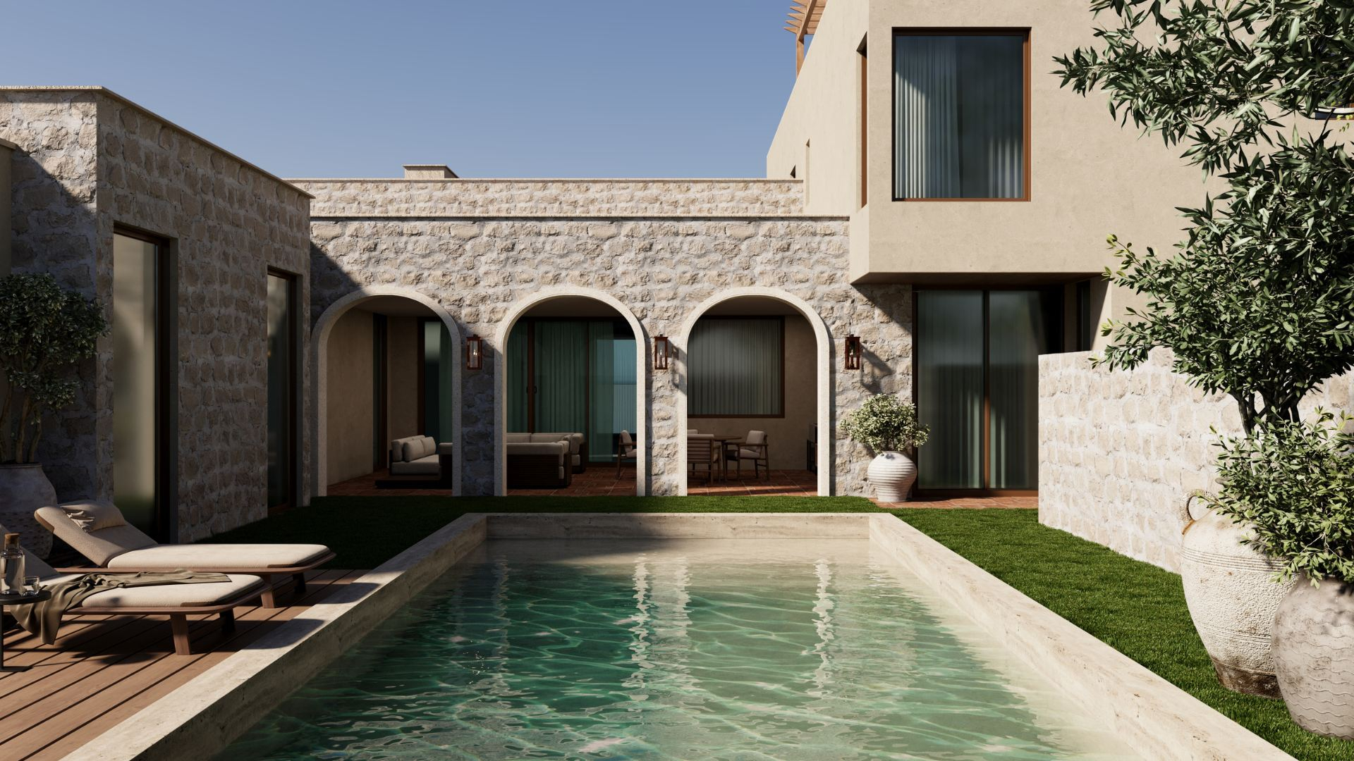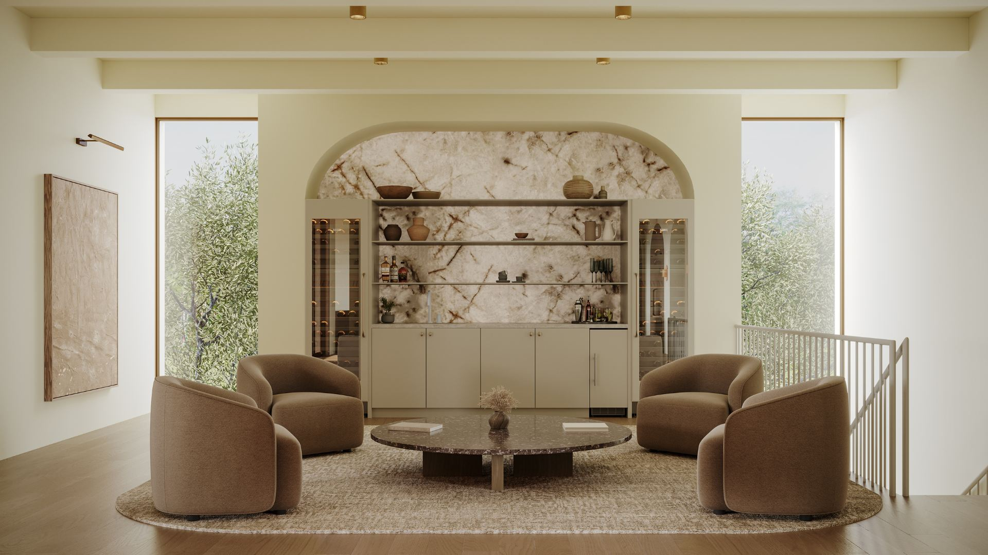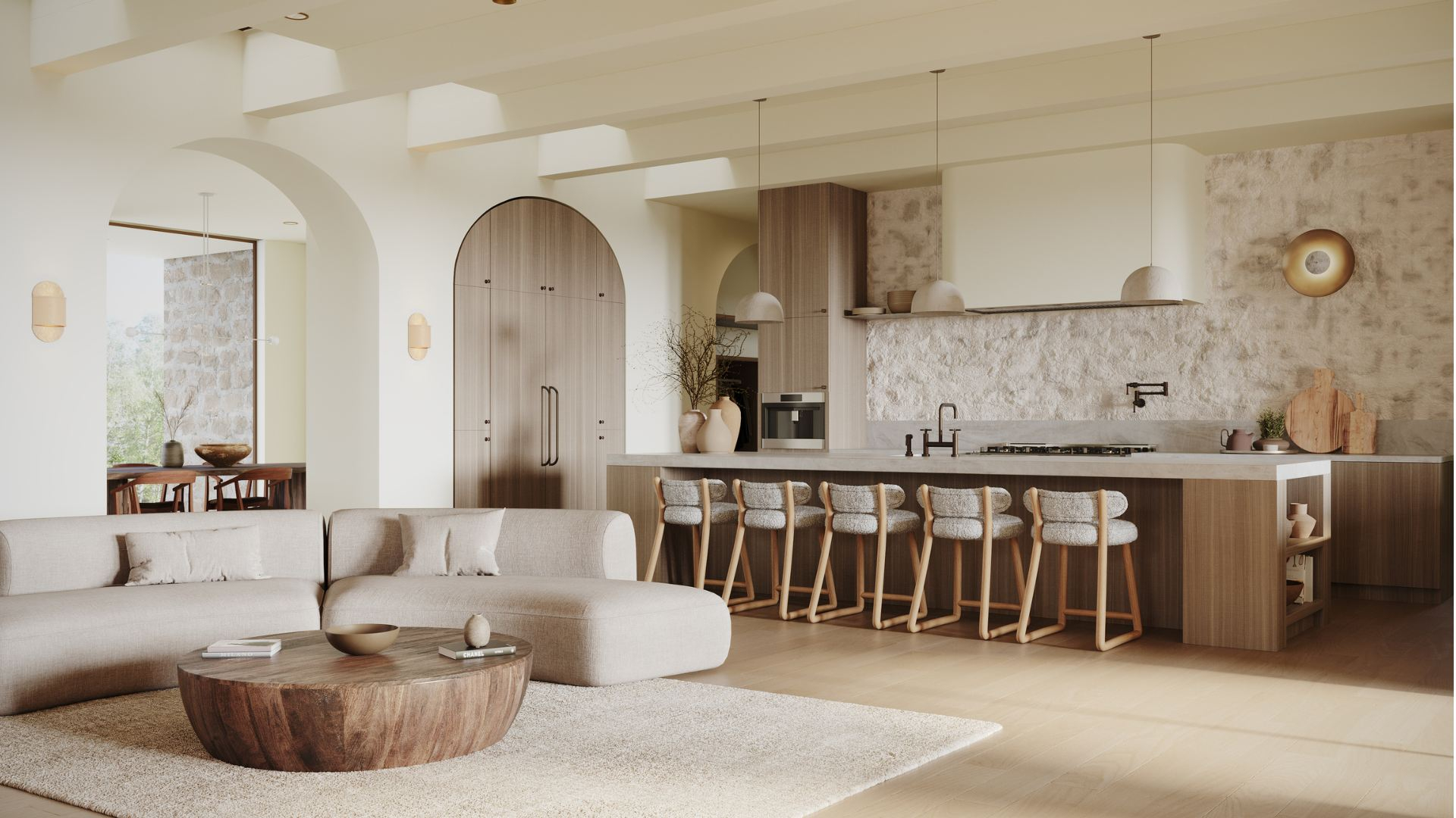The curved doors add a softness to the exterior, blending seamlessly with the surrounding landscape.