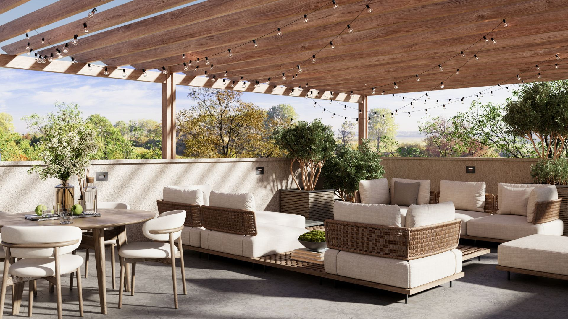 A pergola-covered deck offers panoramic views from every angle.