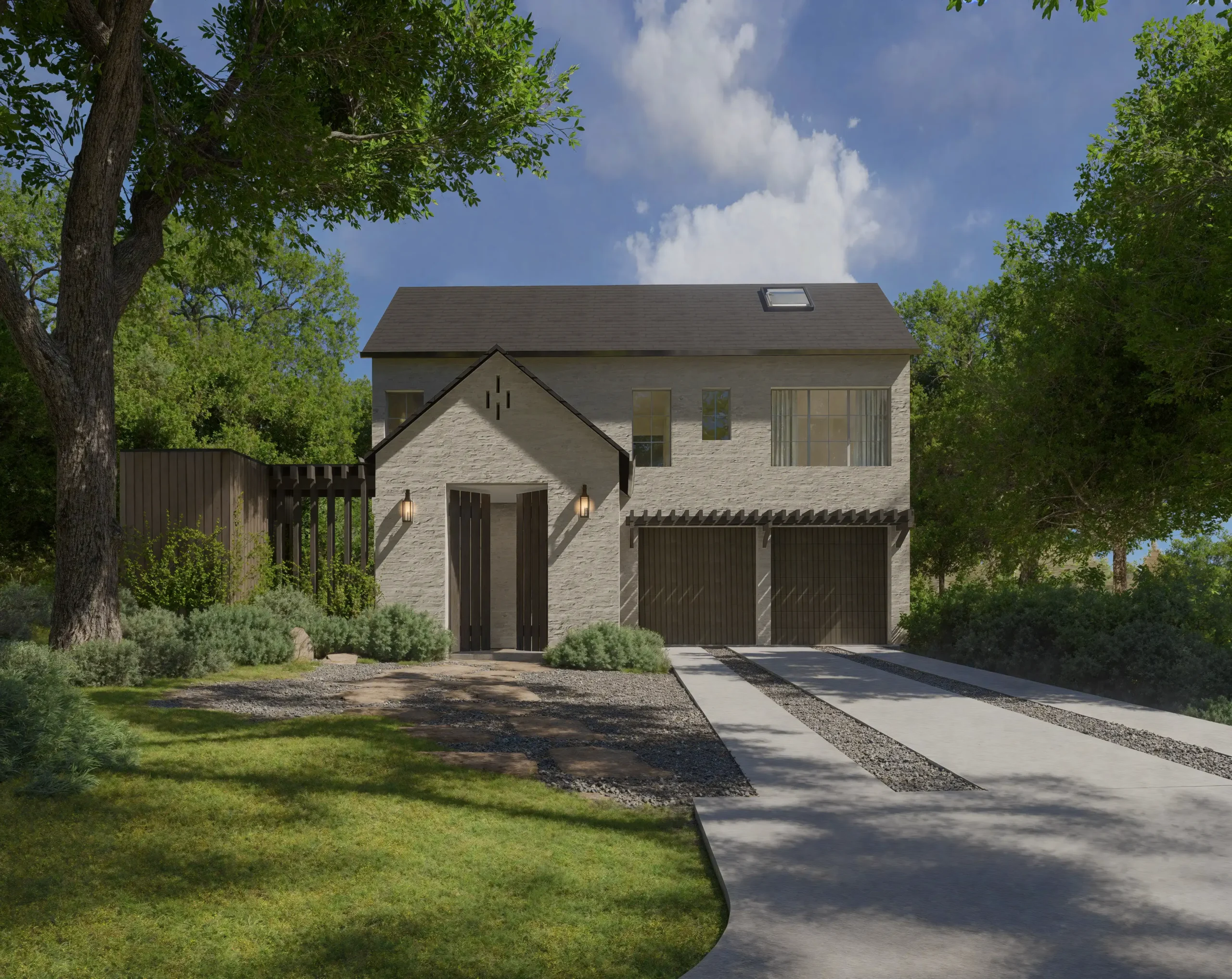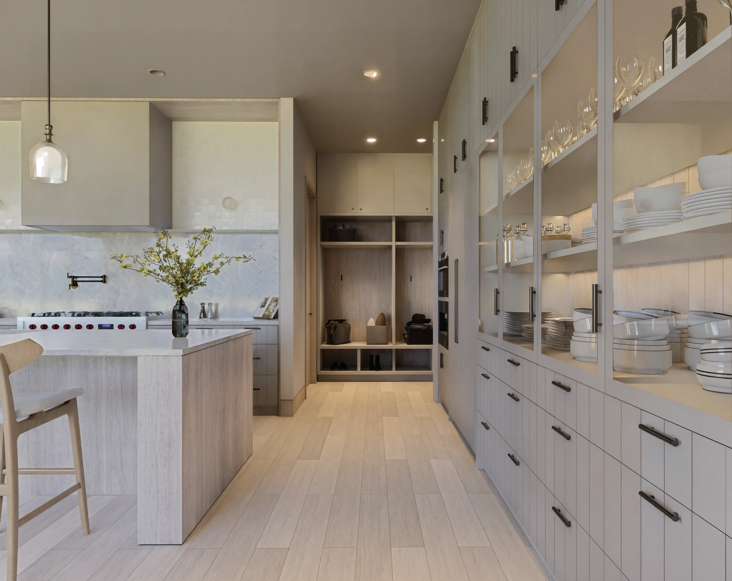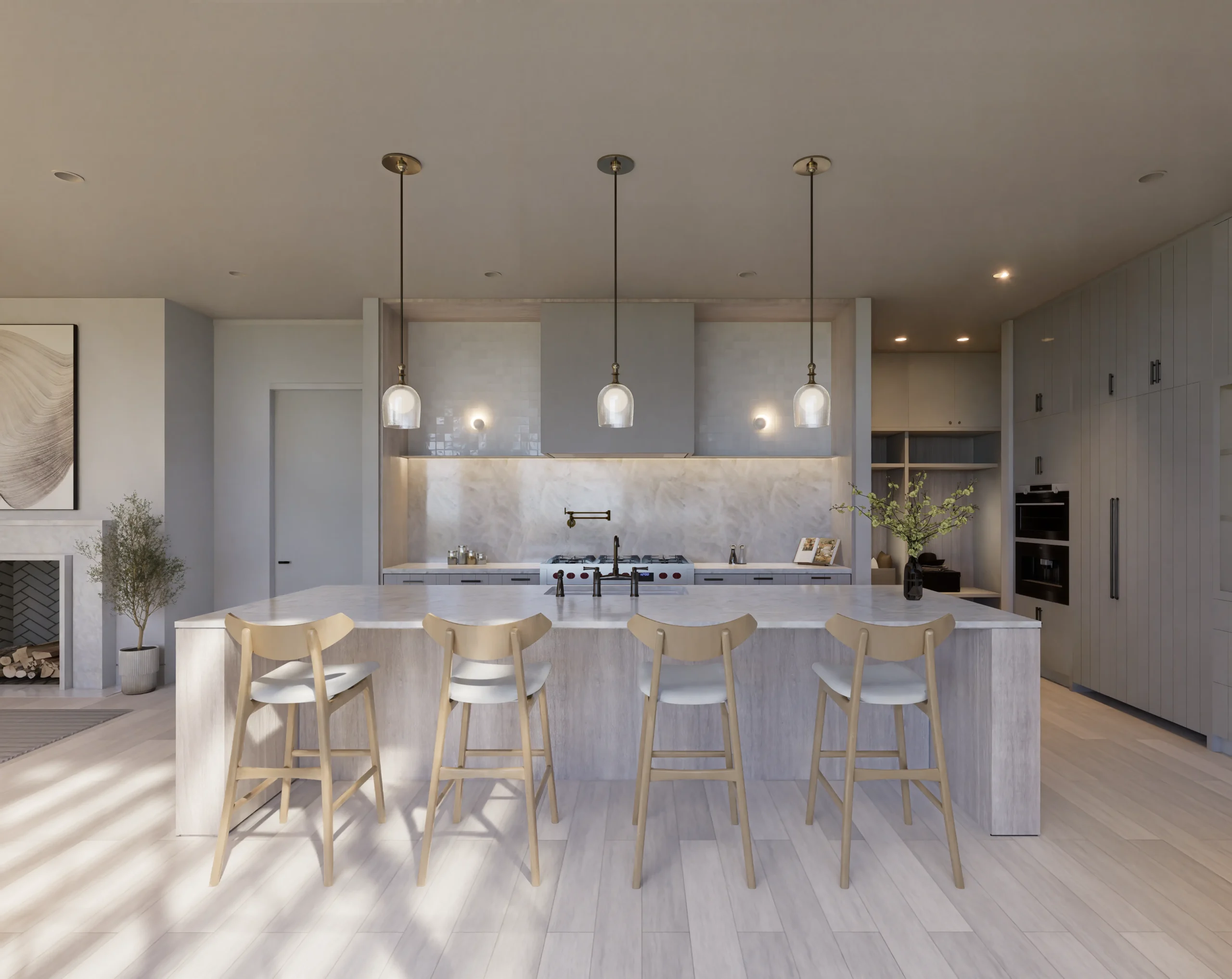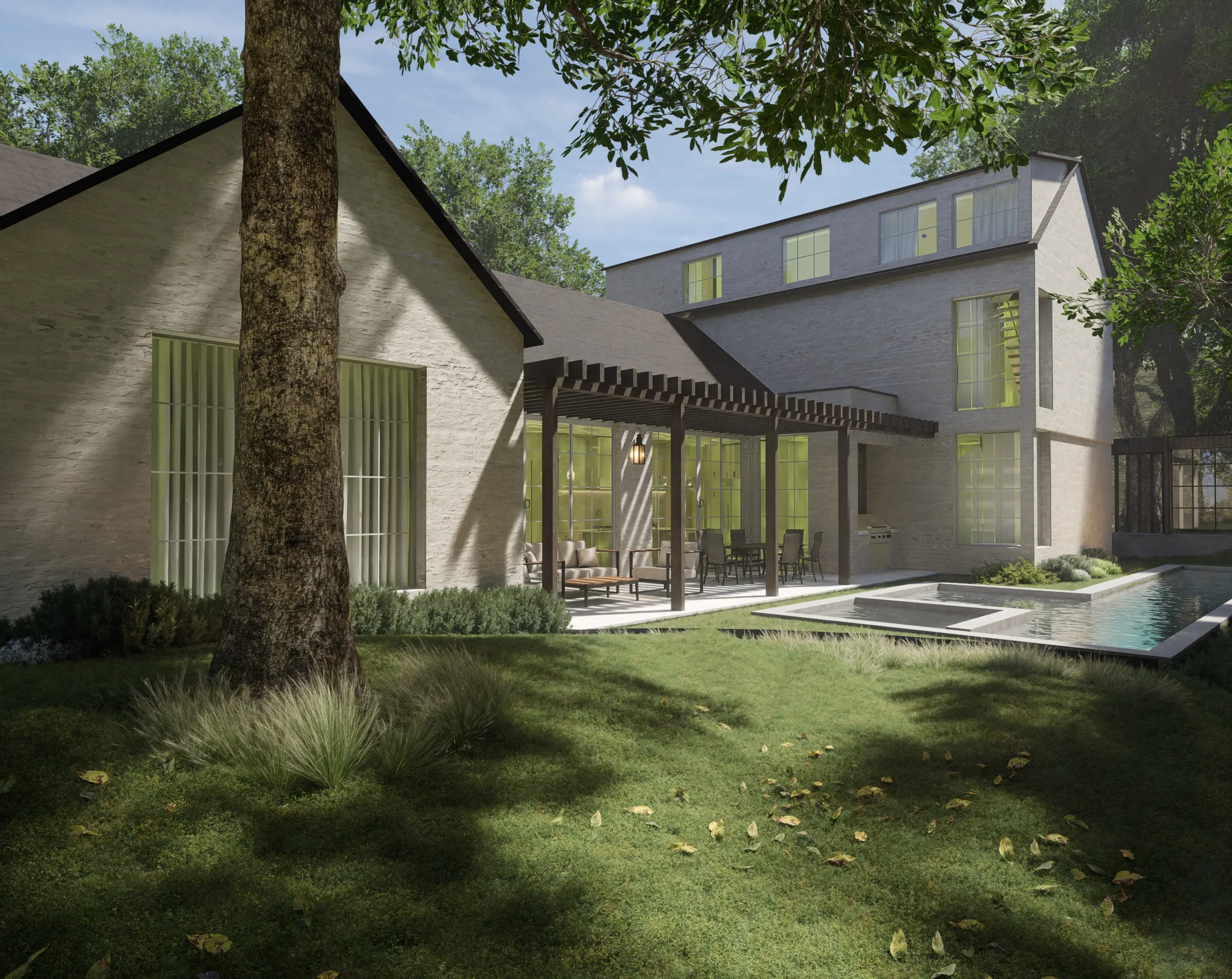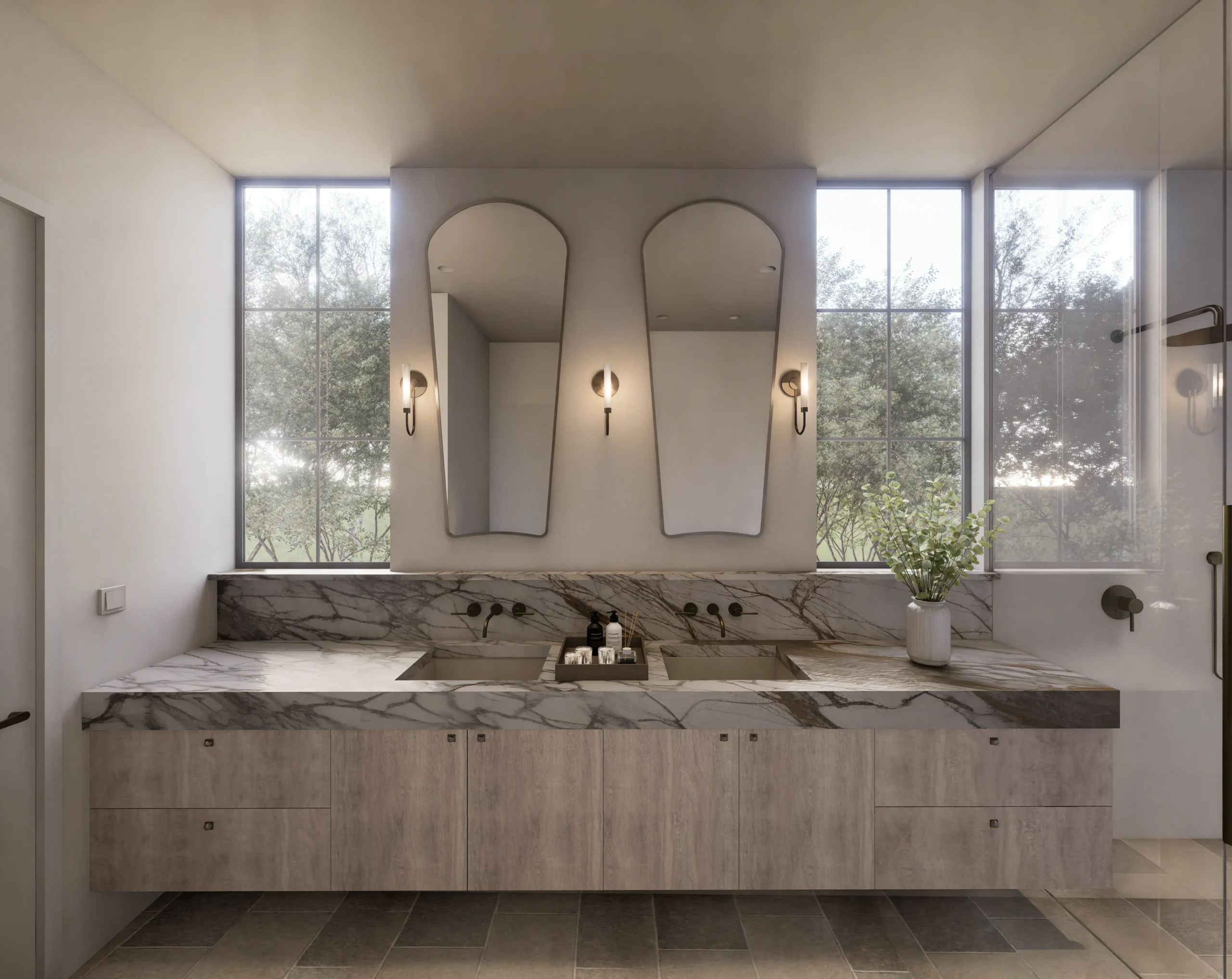 Located on one of Tarrytown’s most beautiful streets, The Canopy House creates its own quiet atmosphere. Inside, sunlight washes over the kitchen’s marble surfaces, where walls of glass slide away to reveal the true heart of the residence: an al fresco sanctuary featuring a lap pool, spa, and a secluded outdoor sauna. The main-floor primary suite serves as a private retreat, distinguished by a sculpted stone vanity and bespoke arched mirrors that echo the organic forms outside. From the warmth of the herringbone hearth in the living room to the third-floor treetop flex space, every corner is designed by Studio Celeste and curated for deep leisure.
