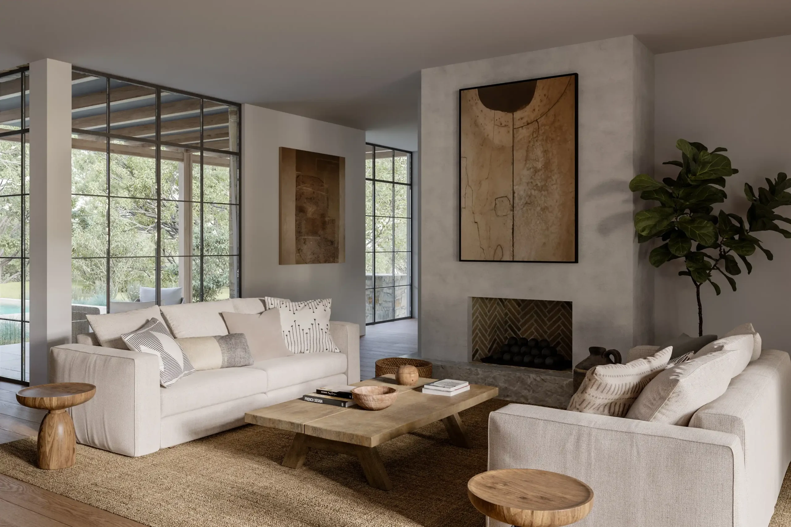 Organized around a private central courtyard, glass-lined corridors frame a secluded outdoor oasis with a pool, spa, and kitchen. Inside, tactile warmth defines the interiors, where custom oak cabinetry meets natural stone to create a sense of organic calm. Thoughtfully programmed with a dedicated guest wing, the residence offers privacy and flexibility while remaining a cohesive home