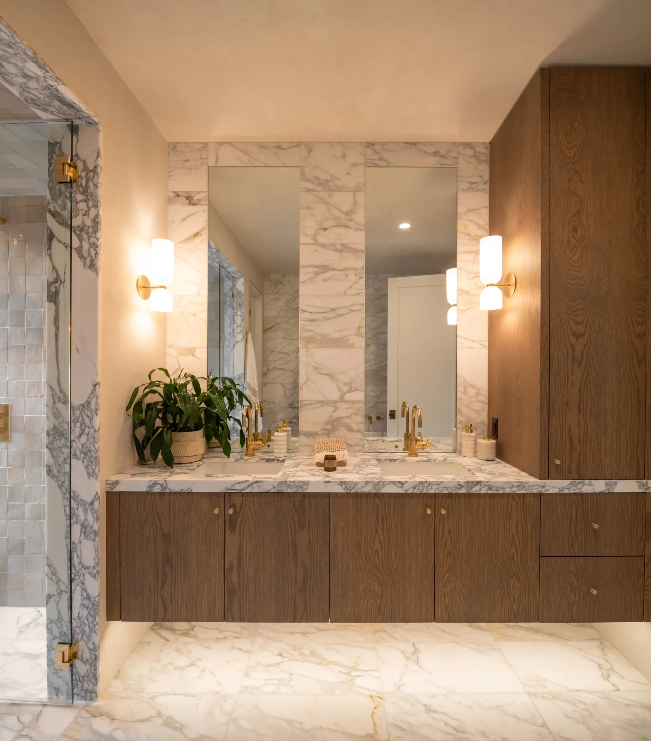 In the powder room, a Calacatta Viola marble floating sink paired with tadelakt plaster creates a striking moment, while outdoor living areas extend the experience with a downtown view, outdoor kitchen, and fireplace.