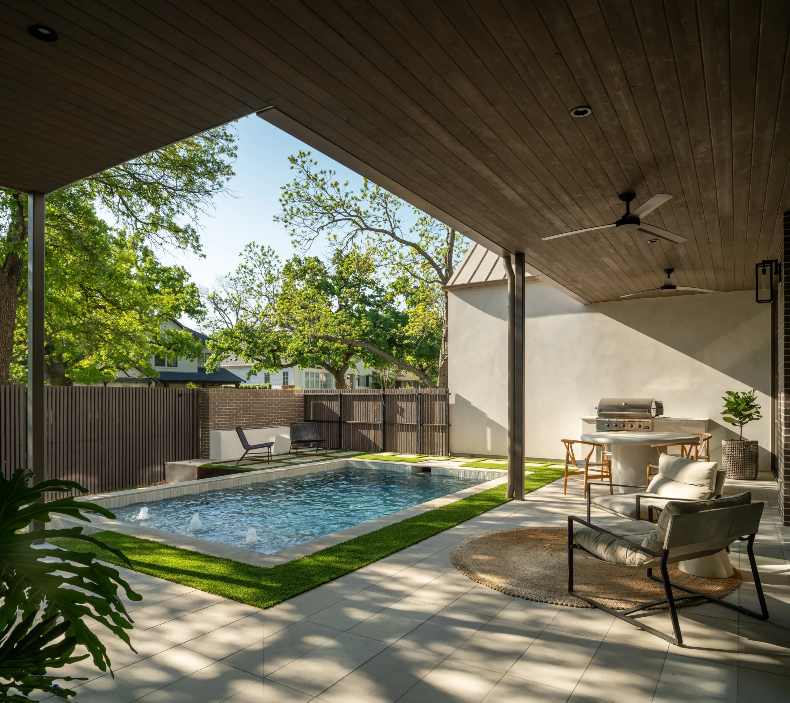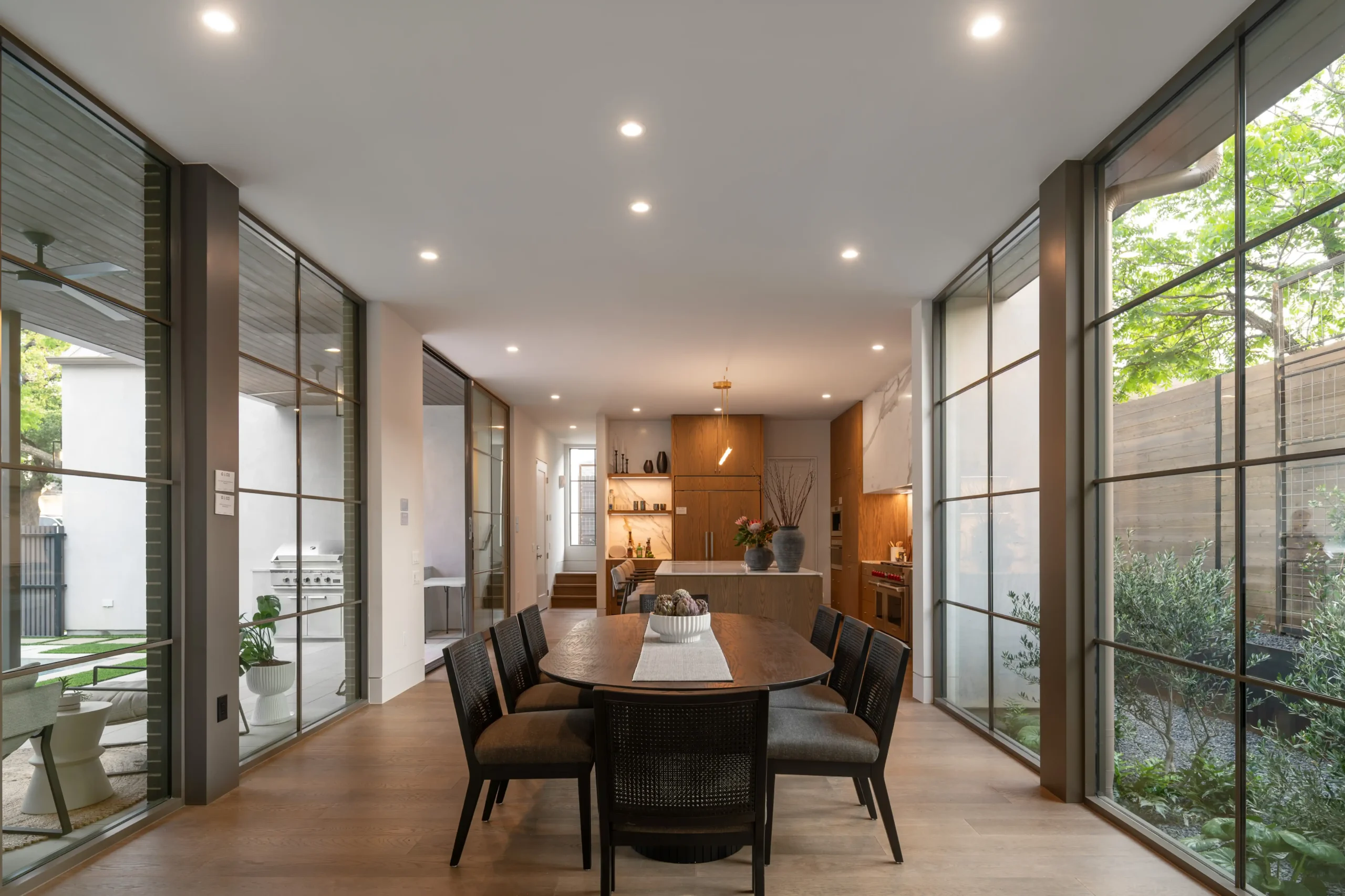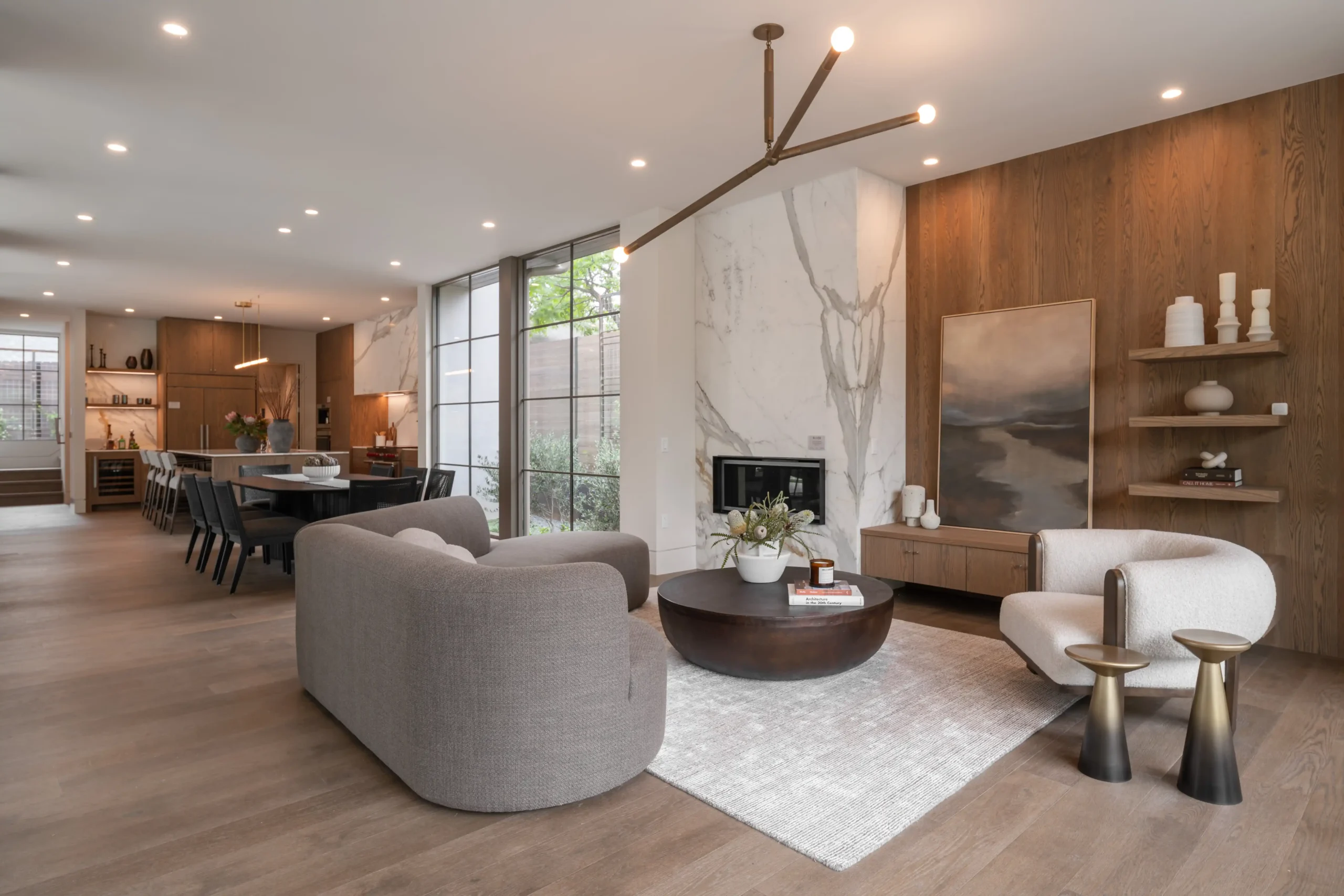 Set just minutes from downtown, The Equinox House is a Studio Celeste design that blends timeless elegance with modern warmth. A Presidio Steel front entry opens to light-filled interiors, where the chef’s kitchen is shaped by Calacatta Gold Borghini marble and custom rift-sawn white oak cabinetry. These materials establish a warm, refined tone that carries through the kitchen and primary suite.