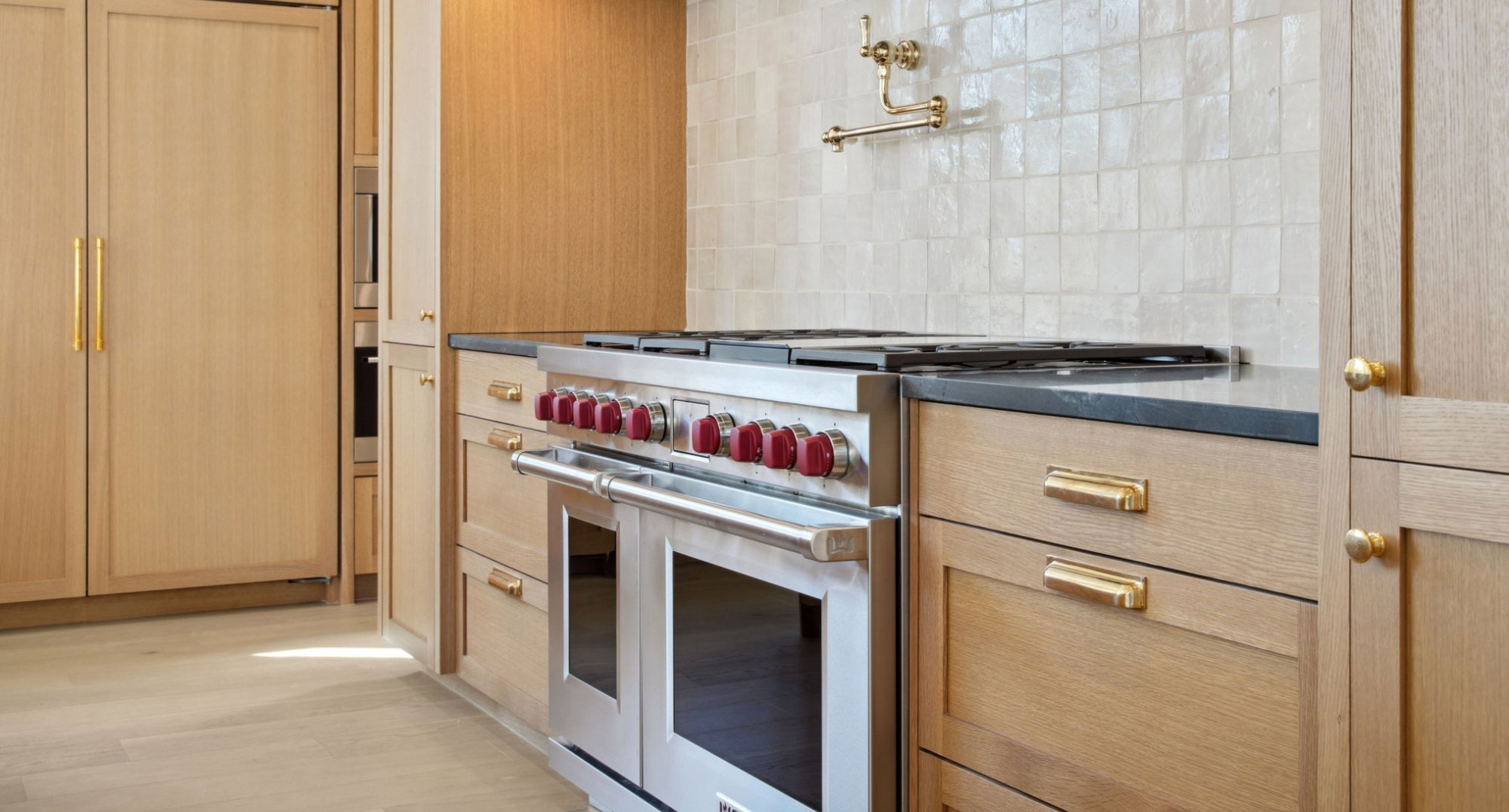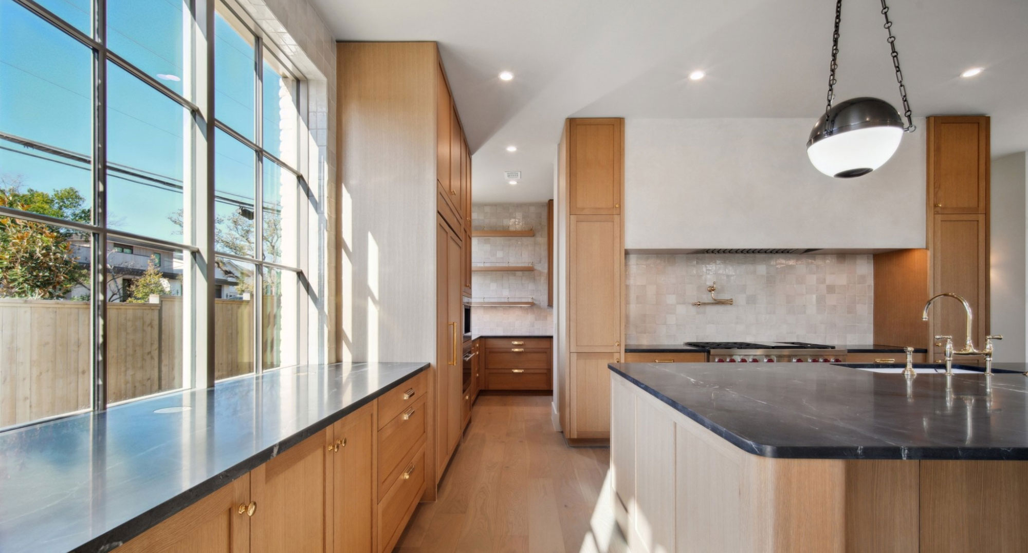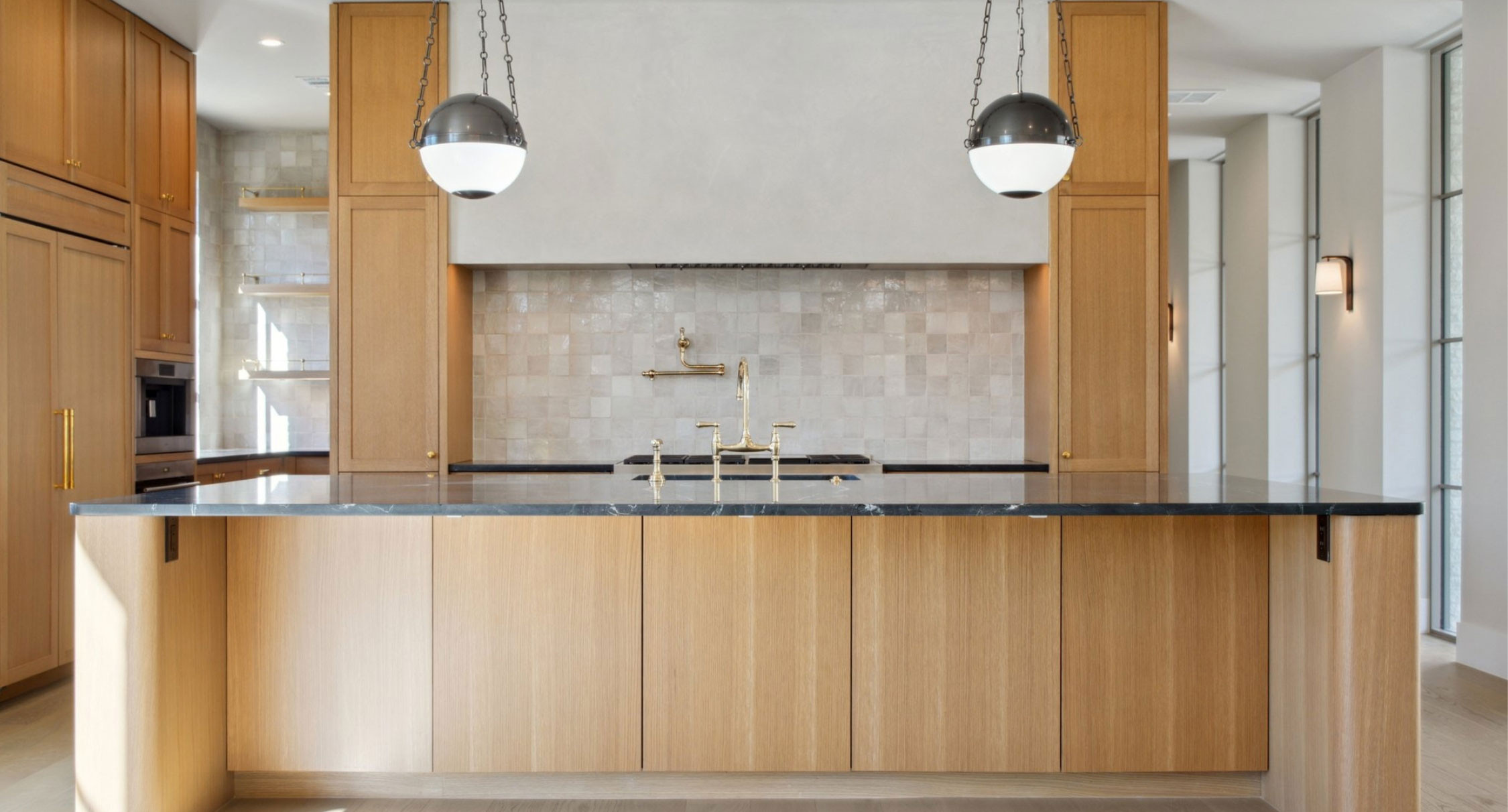 Warm solid wood wide planks keep the design airy and clean