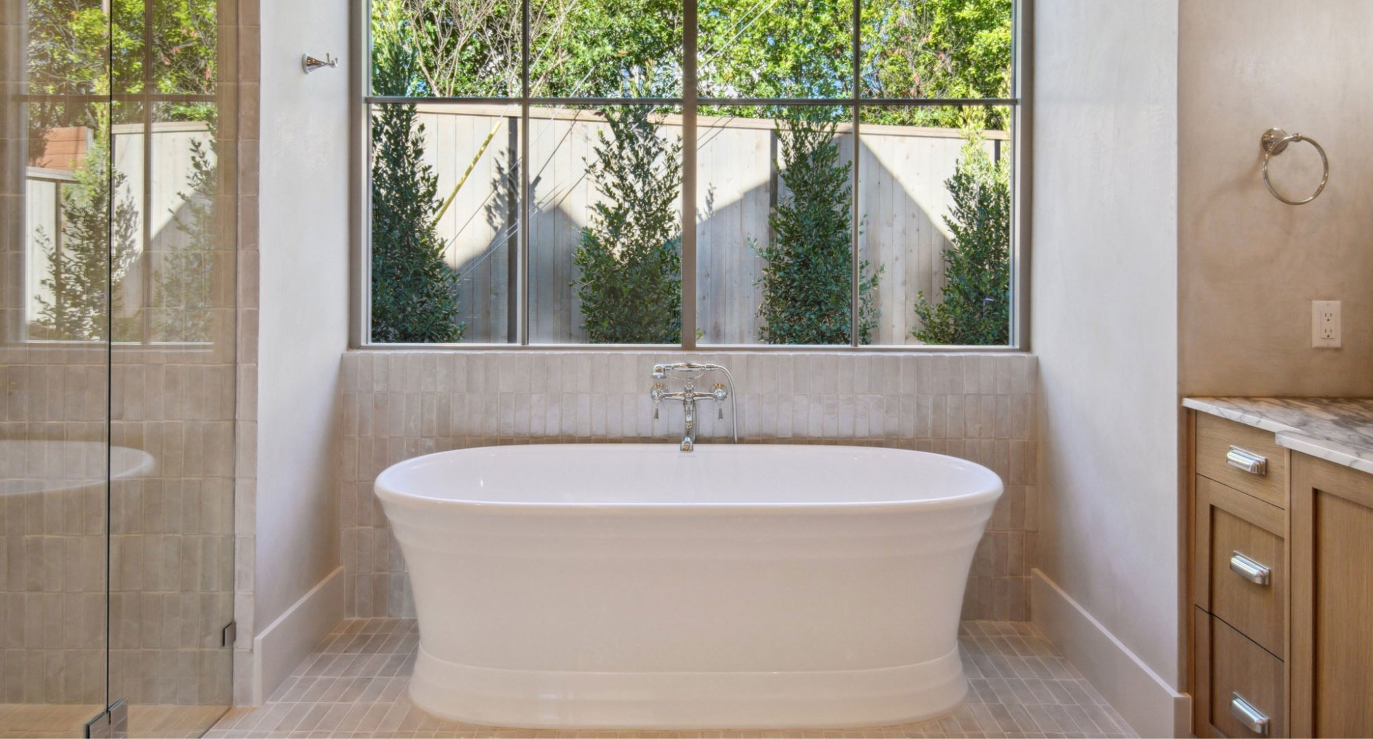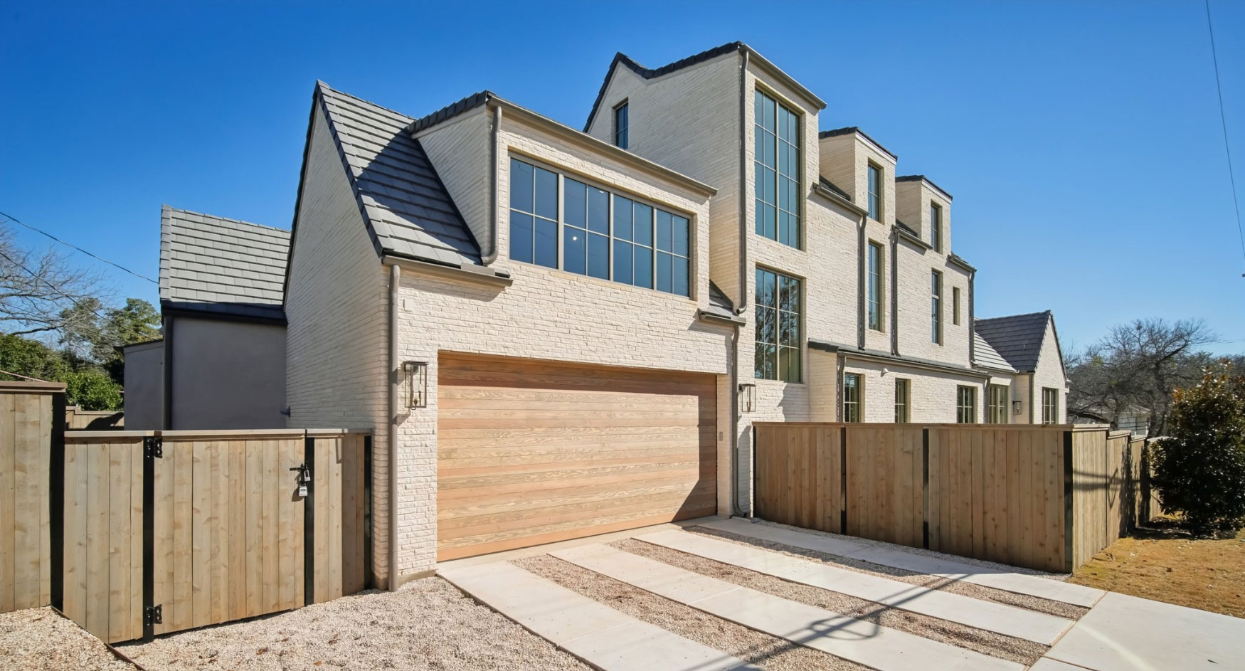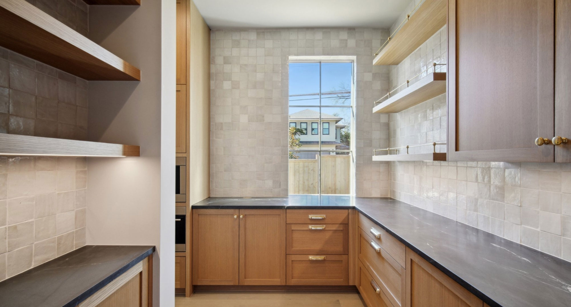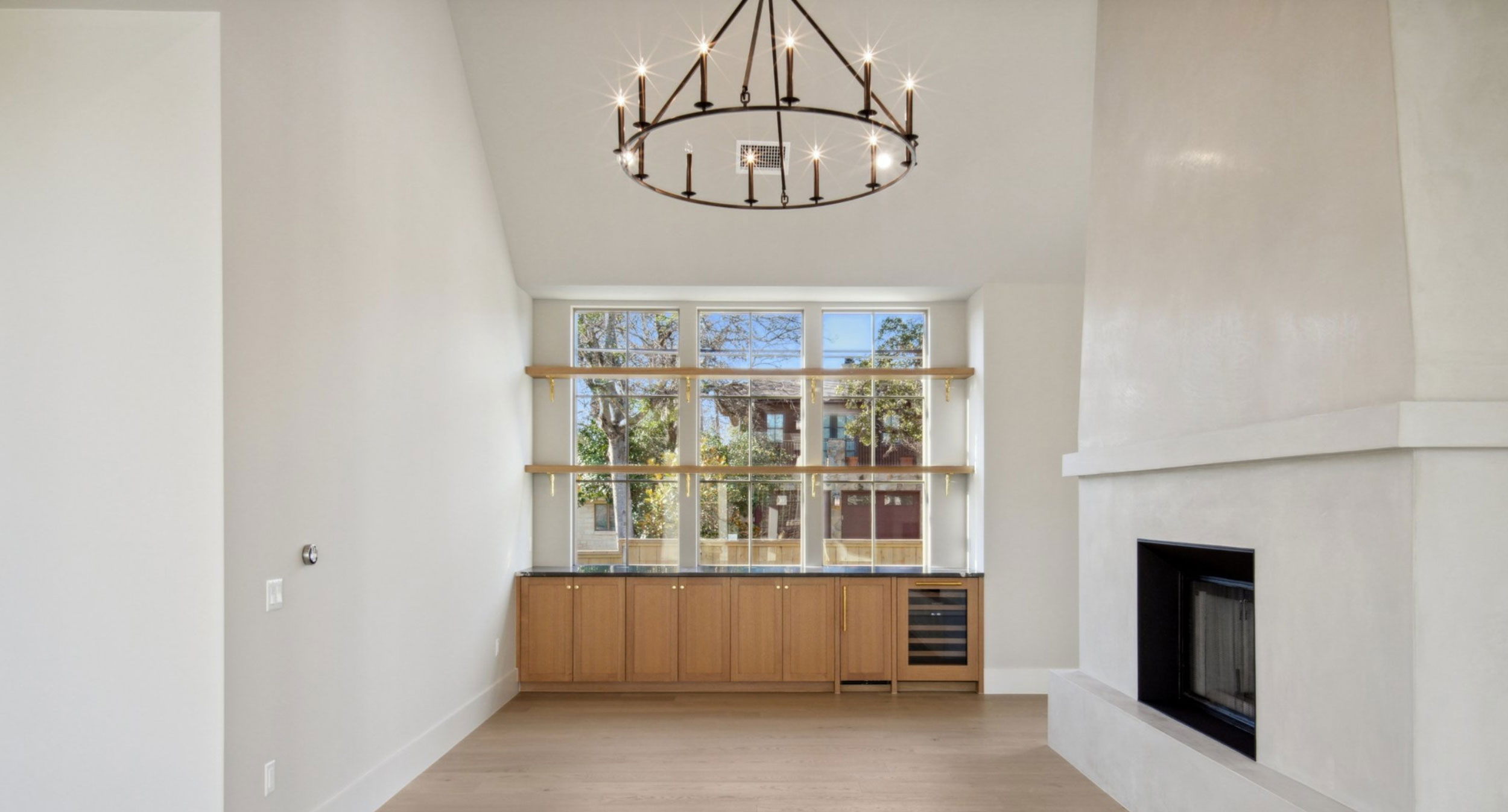 Warm solid wood wide planks keep the design airy and clean