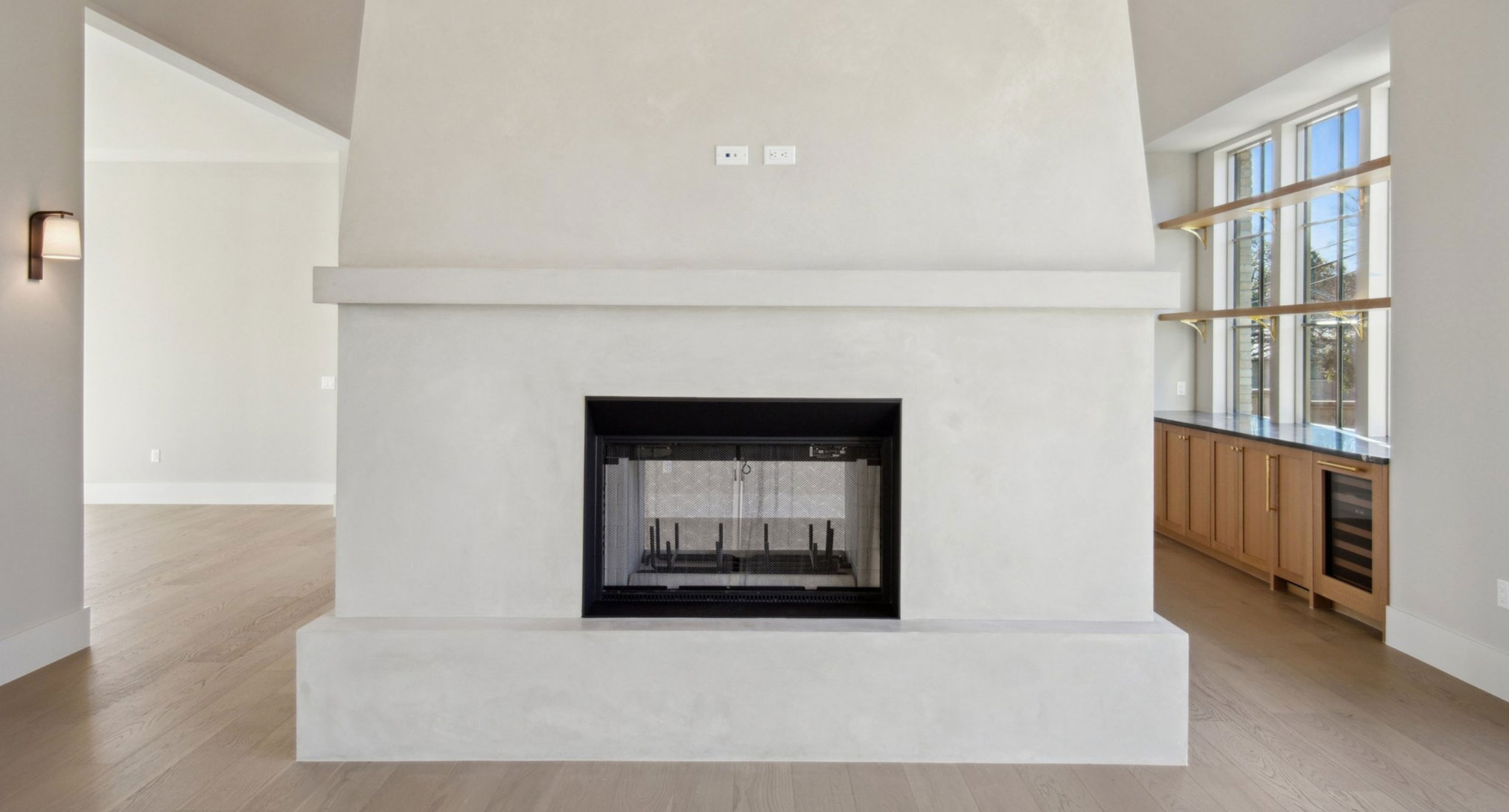 A double-sided fireplace that is a window between living and dining